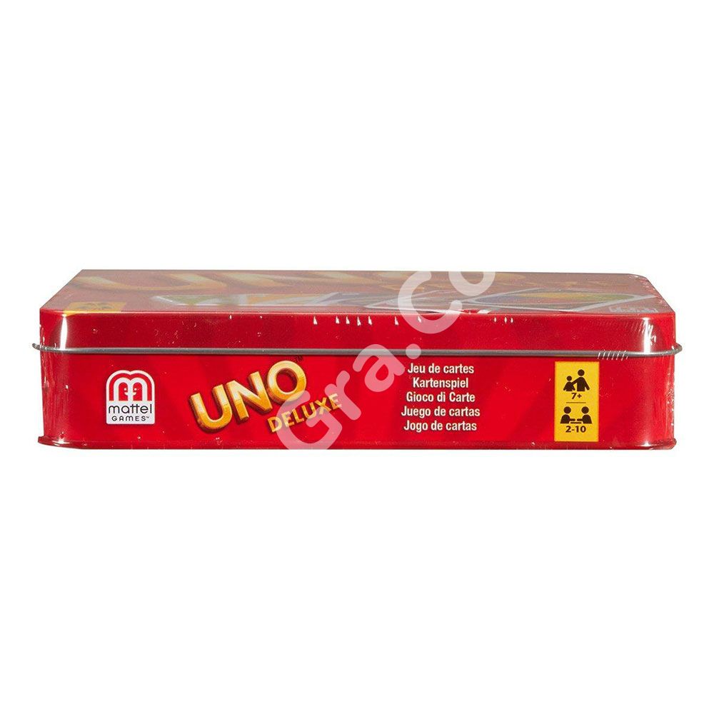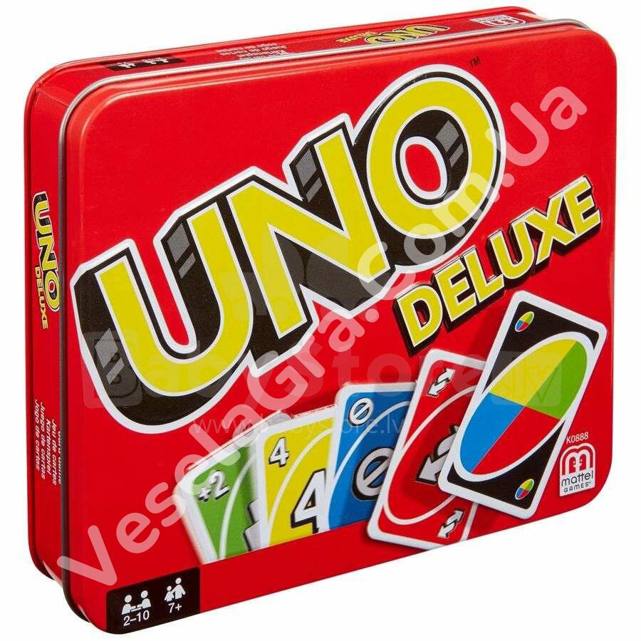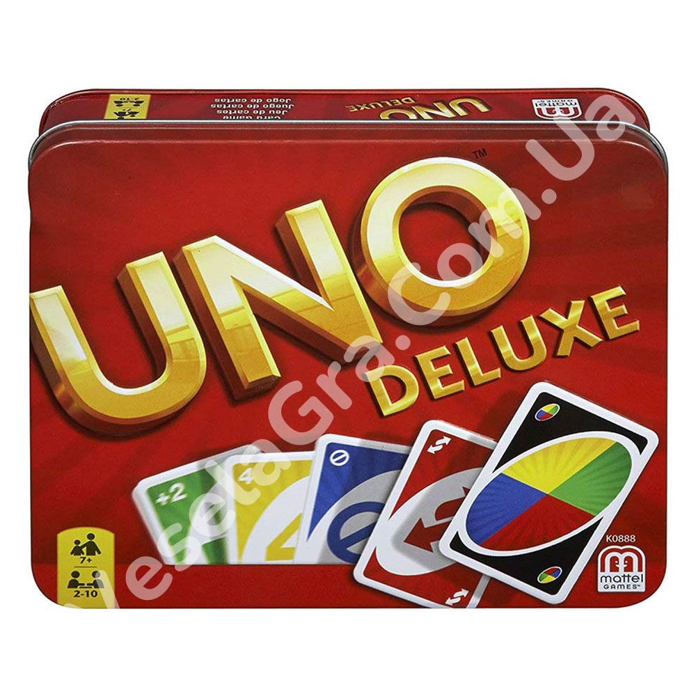 Уно Deluxe – покращена версія легендарної карткової гри Уно у привабливій жерстяній коробці . Це проста та цікава гра для будь-якого віку. Компактні розміри роблять її дуже зручною дорожньою грою.