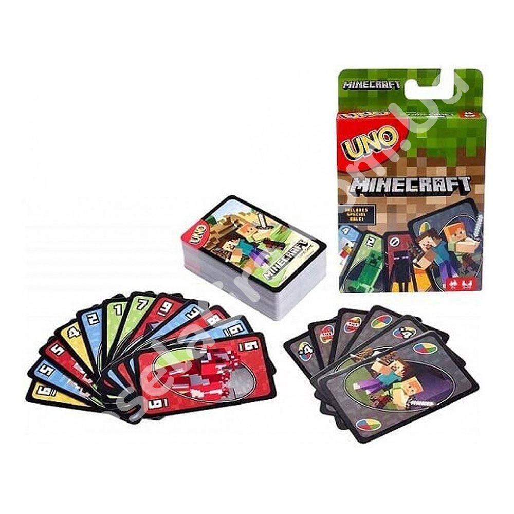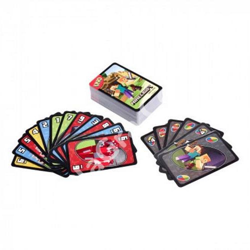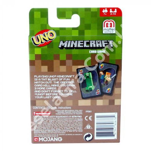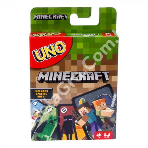 UNO Minecraft – тематична версія легендарної карткової гри Уно за мотивами популярної комп’ютерної гри Minecraft. Це проста та цікава гра для будь-якого віку. Компактні розміри роблять її дуже зручною дорожньою грою.