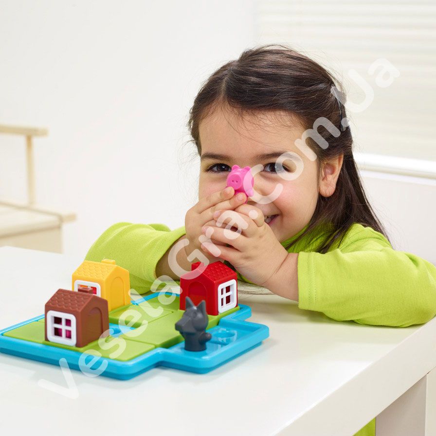 Ігрове поле, 3 деталі головоломки, 3 поросятка, 1 вовк, буклет із 48 завданнями, книга-казка в малюнках