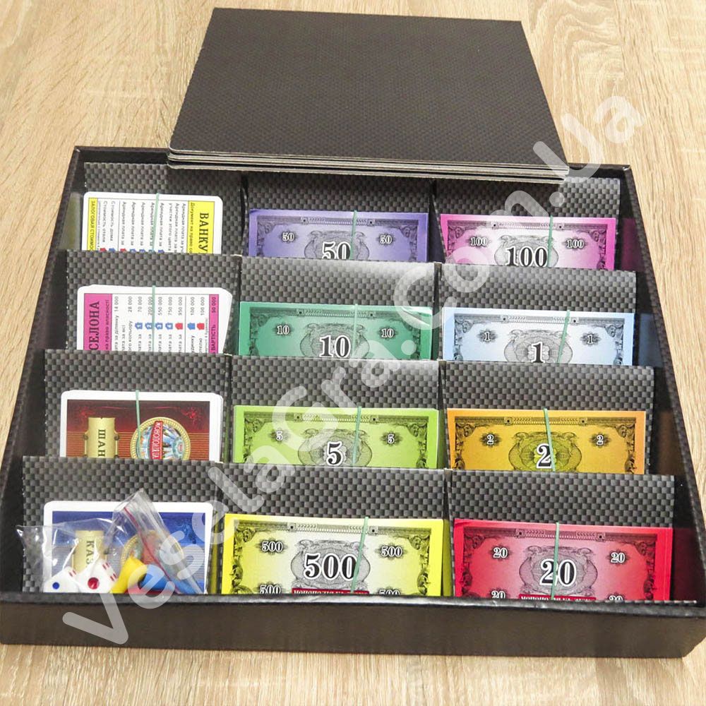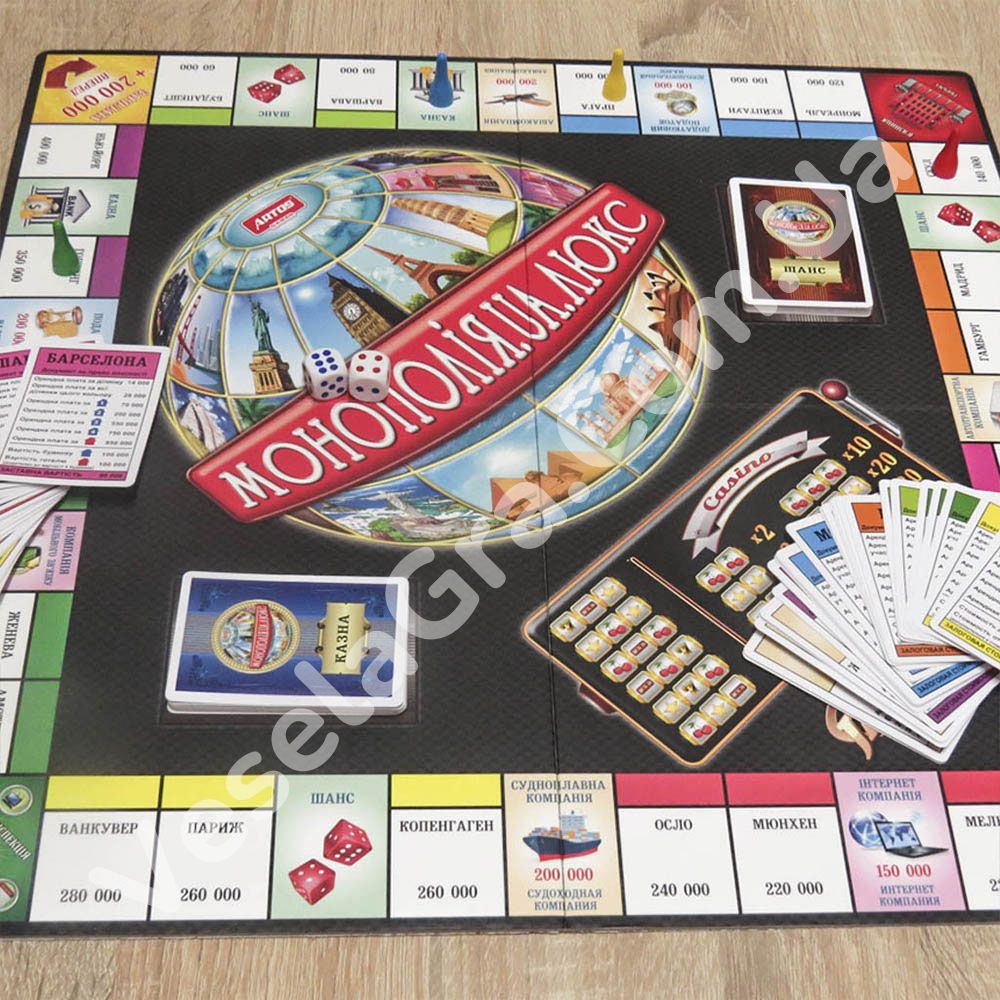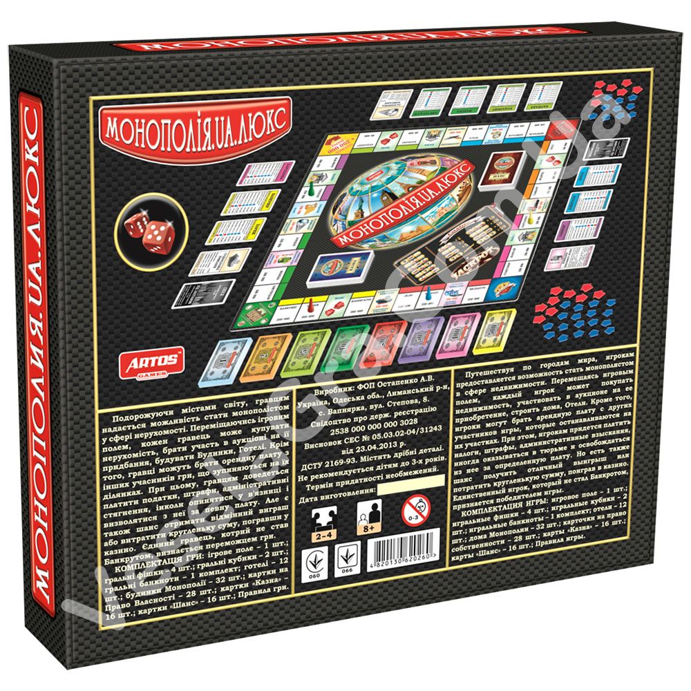 Ігрове поле (на укр. та рос. мовах) , 28 карток на Право Власності на укр. мові., 28 карток на Право Власності на рос. мові, 16 карток Казна , 16 карток Шанс, Банкноти Монополія.UA.Люкс, 12 готелів., 32 будинки, 4 фішки, 2 кубики, правила гри